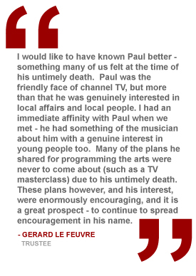 Although his parents were professional musicians it was only late in life that Paul took up a musical instrument - the saxophone. Typically, he taught himself but his abilities were recognised when was he was invited to join the Jersey Big Band (above). Paul's life was based on three things. First, his professional career which appeared to his colleagues to be discharged effortlessly; as news editor he would rarely start compiling and scripting the daily news programme until after lunch. Secondly, a voracious appetite for the written word; The Times before lunch, its crossword over a sandwich and the latest biography before bedtime. Thirdly, a passion for music in almost all its forms; he was continually building extra shelves to hold new records and, later, CDs. When his collection was put up for sale after his death it occupied an entire public hall! Those who browsed were astonished to find everything from Mozart to Glenn Miller, the Bonzo Dog Doodah Band ("J Arthur Rank on gong"...) to the Beatles. And, of course, the elegant Ella Fitzgerald, his very great favourite, whom he saw in concert in Jersey. The proceeds from the auction of Paul's extraordinary collection of vinyl were added to that raised by the sale of his estate to form The Paul Brown Memorial Trust. To read Paul Brown's obituary in the Jersey Evening Post click here. To read the eulogy delivered at Paul's funeral in November 1997 click here. | ![]() |